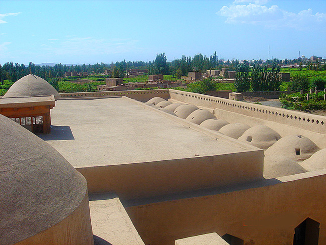 This is the mosque with its arched gate. It is the largest, simplest and plainest mosque in the Turpan area. The mosque has a Hall of Prayer, Doctrine-teaching rooms and a gate tower. Unusually, this mosque does not have a pool of water for washing. Muslims, always have to wash before worshipping. However, instead of water, it is permissible to use clean sand, clay or stone for cleansing. In the main hall. there is no figurine, no colors or designs of any kind except the yellow of the bricks. The rectangular hall can hold up to one thousand people attending a service.
