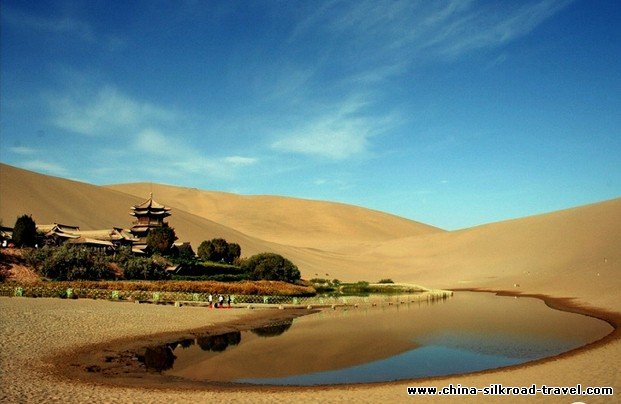 Echoing-Sand Mountain and Crescent Lake: Together with the Crescent Spring and the Mogao Caves, the Echoing-Sand Mountain is the most popular tourist site in Dunhuang. Echoing-Sand Mountain, known as Mingsha Mountain to the Chinese, is 5 km to the south of Dunhuang and is famous for the constant sound of the moving sand. Legend has it that many years ago a horrific battle was fought here, and the sounds we hear today were the haunting cries of soldiers buried in the sand dunes. Situated within the Echoing-Sand Mountain Park, the Crescent Moon Lake is literally an oasis in the desert. The lake’s name derives from the crescent moon shape taken by the pool of spring water between two large sand dunes. Although the surrounding area is very dry, the pool surprisingly doesn’t dry up as one might expect.