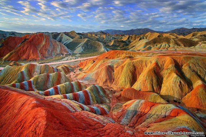 Zhangye Danxia Landform Geological Park: The park is 40 kilometers from Zhangye County and 20 kilometers from Linze County. It is most developed and the most frequented one among the three similar parks in the region. Large areas of northwestern China are sparsely populated, and contain stunning scenic locations unheard of by outsiders. On this trip, the highlight is the Danxia Landform of Zhangye — magnificently multi-coloured mountains, valleys, hills, and cliffs that ripple away towards the horizon.