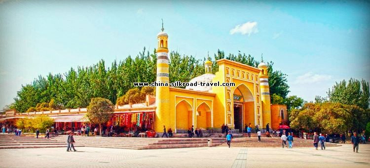 Id Kah Mosque: This is the largest mosque in China, and the most famous mosque in Xinjiang. The construction of the mosque started in the middle of the 15th century, and the mosque has gradually developed to its present size. The buildings of Id Kah Mosque look magnificent and solemn, and displaying the artistic styles of Islamic mosque architecture. This Mosque has an area of about 16,800 square meters, consisting of the Pray Hall, the Koran teaching Hall, the Corridor, the Arches and other buildings attaching to it. The Pray Hall of the mosque, which can hold 4,000 prayers, is supported by 140 carved wooden pillars.