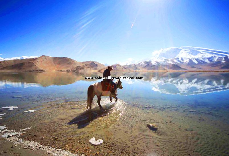 Karakul Lake: At an altitude of 3600m, this is the highest lake of Pamir plateau, near the junction of Pamir, Tianshan (Heavenly Mountain), and Kunlun Mountain ranges. Surrounding by snow-covered mountain throughout the year, the three highest peaks visible from the lake are Muztag Ata (7546m), Konur Tagh (7649m) and Kongur Tiube (7530m). This lake is popular among travelers for its beautiful scenery and the clarity of its reflection in the water, whose color ranges from a dark green to azure and light blue. There are two Kirgiz settlements along the shore of Karakul Lake, a number of yurts located at about 1 km east of the bus drop-off point and there is also a village with stone houses on the western shore.