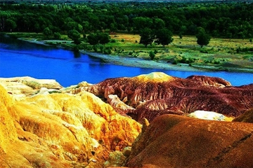 Burqin Colorful Beach: Burqin Colorful Beach actually refers to the banks of a river that has desert, oasis and forest on its south side while sand/rock mounds in all shapes formed by years of wind erosion, line the north bank. The mounds have very irregular profiles and although they are mainly red, bands of red, white, black and yellow are also found in them