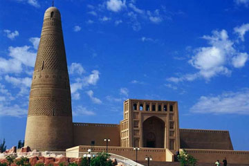 Sugong Minaret: Located in Mura Village 2km to the east of the city of Turpan, the minaret tower was built in the 41st year of the long reign of Qianlong Emperor during the Qing Dynasty. It is the embodiment of the ancient architectural arts of the Uighur people. The body of the tower is cylindroid in shape, built with bricks arranged in various symmetrical patterns on the outer wall. The tower has 14 windows and a spiral staircase inside going to the top.
