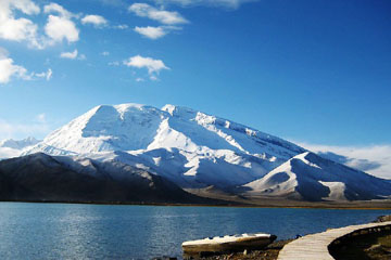 Karakul Lake: At an altitude of 3600m, this is the highest lake of the Pamir plateau, near the junction of the Pamir, Tianshan (Heavenly Mountain), and Kunlun Mountain ranges. Surrounded by mountains which remain snow-covered throughout the year, the three highest peaks visible from the lake are the Muztag Ata (7546m), Konur Tagh (7649m) and Kongur Tiube (7530m). The lake is popular among travelers for its beautiful scenery and the clarity of its reflection in the water, whose color ranges from a dark green to azure and light blue. There are two Kirgiz settlements along the shore of Karakul Lake, a number of yurts about 1 km east of the bus drop-off point and a village with stone houses located on the western shores.