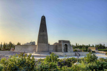 Apak Hoja Tomb This Mazar is the holiest place in Xinjiang and an architectural treasure Built in 1640 , it is reminiscent of the Central Asian artistic style of Samarkand or Isfahan. A handsome blue-and-white tiled gate leads into the compound, which includes a small religious school and the Abakh Khoja family tomb. The latter is domed and faced with muti - colored tiles.