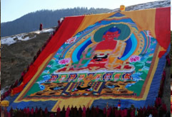 After breakfast we will experience the Sunbathing Buddha Festival, which is held on the 13th of January (China Luna calendar). The Sunning of the Buddha is a spectacular sight for any traveler to witness. The morning begins with Cham dancing, performed by monks in splendid robes and hats, some wearing fearsome masks and others with their faces painted in ferocious expressions. The dances are slow and grotesque, accompanied by doleful brass horns, cymbals and drums, and are intended to dispel all evil spirits. After hours of dancing, praying and chanting of scriptures, a 30m by 20m roll of multi-colored applique and embroidered thangka is proudly and reverently paraded through the streets from the monastery to the hillside across the river. All along the route, faithful Buddhists scramble to press their foreheads and hands against this sacred image, while mounted riders laughingly clear the way by snapping their whips as their spirited horses rear and snort. As the procession reaches the bridge that crosses the Daxia River, thousands scatter to find the most perfect vantage point for the sunning ceremony.