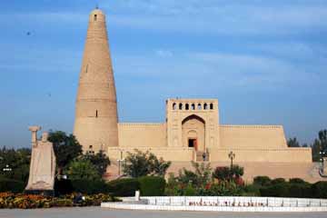 Sugong Minaret: Located in Mura Village 2km to the east of the city of Turpan, the minaret tower was built in the 41st year of the long reign of Qianlong Emperor during the Qing Dynasty. It is the embodiment of the ancient architectural arts of the Uighur people. The body of the tower is cylindroid in shape, built with bricks arranged in various symmetrical patterns on the outer wall. The tower has 14 windows and a spiral staircase inside going to the top.