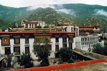 Sera and Drepung:Situated at the foot of the Mountain Gambo Utse, 5 kilometers (3.1 miles) from the western suburb of Lhasa, the Drepung Monastery is known as the most important monastery of Gelugpa in Tibetan Buddhism. It is considered one of the 'Three Great Monasteries' (the other two are theGanden Monastery and the Sera Monastery. Covering an area of 250,000 square meters (299,007 square yards), it held 7,700 monks in total and possessed 141 fazendas and 540 pastures in its heyday, and is the largest-scale monastery among the ones of the same kind. Seen from afar, its grand, white construction gives the monastery the appearance of a heap of rice.