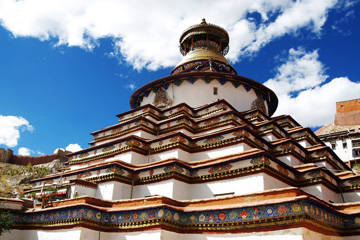 Kunbum Pagoda:Jiangba, the jamrese of a Thousand Hands and a Thousand Eyes in the monastery. There is a hall of arhat made during the Ming Dynasty.Another name of the monastery is Pelkor Chode Monastery.The arhats are so vivid that they look very much alive. Besides the monastery is the world famous 9-storey100,000-Buddha Pagoda (Kunbum Pagoda.It stands 32 metres highly, has 108 doors, 77 Buddhist chambers and countless shrines. Enshrine in the Pagoda are 100,000 statues of Buddha.The Pagoda opens 8 doors, which are decorated with relief sculptures of lively flying dragons, running lions and walking elephants.It is a master-piece of the joint efforts of the Nepalese, Tibetan and Chinese.
