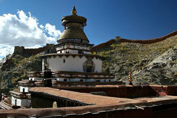 Kunbum Pagoda:Jiangba, the jamrese of a Thousand Hands and a Thousand Eyes in the monastery. There is a hall of arhat made during the Ming Dynasty.Another name of the monastery is Pelkor Chode Monastery.The arhats are so vivid that they look very much alive. Besides the monastery is the world famous 9-storey100,000-Buddha Pagoda (Kunbum Pagoda.It stands 32 metres highly, has 108 doors, 77 Buddhist chambers and countless shrines. Enshrine in the Pagoda are 100,000 statues of Buddha.The Pagoda opens 8 doors, which are decorated with relief sculptures of lively flying dragons, running lions and walking elephants.It is a master-piece of the joint efforts of the Nepalese, Tibetan and Chinese.