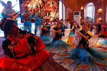 Uyger Show The folk dance in Turfan is famous for its grace, nature, lightness and cheerfulness. Under grape trellises in summer, loud and clear sounds of tambourines and Suona horns, graceful dance, and affecting “Meshrep” can clear up the hotness and refresh you after you journey.