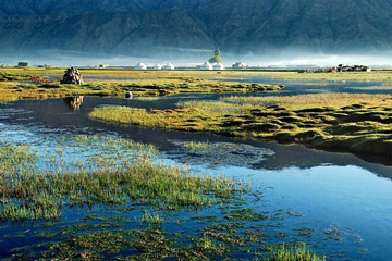 Karakul Lake: At an altitude of 3600m, this is the highest lake of the Pamir plateau, near the junction of the Pamir, Tianshan (Heavenly Mountain), and Kunlun Mountain ranges. Surrounded by mountains which remain snow-covered throughout the year, the three highest peaks visible from the lake are the Muztag Ata (7546m), Konur Tagh (7649m) and Kongur Tiube (7530m). The lake is popular among travelers for its beautiful scenery and the clarity of its reflection in the water, whose color ranges from a dark green to azure and light blue. There are two Kirgiz settlements along the shore of Karakul Lake, a number of yurts about 1 km east of the bus drop-off point and a village with stone houses located on the western shores.